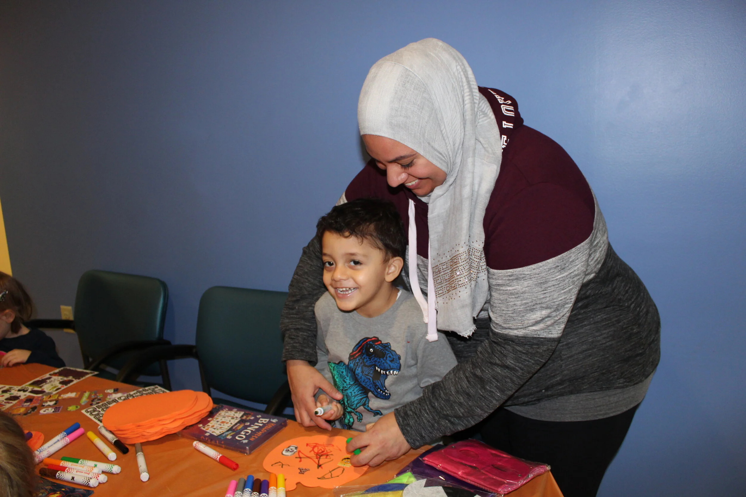 We had two tables set up in the play room, where one table was a makeup station with tiaras and the other was full of crafts and superhero capes. We had foam pumpkins for the kids to decorate with markers, Halloween stickers and super hero stickers for them to use. The kids really enjoyed the festive craft and using their creativity to customize a pumpkin during a Halloween season.
